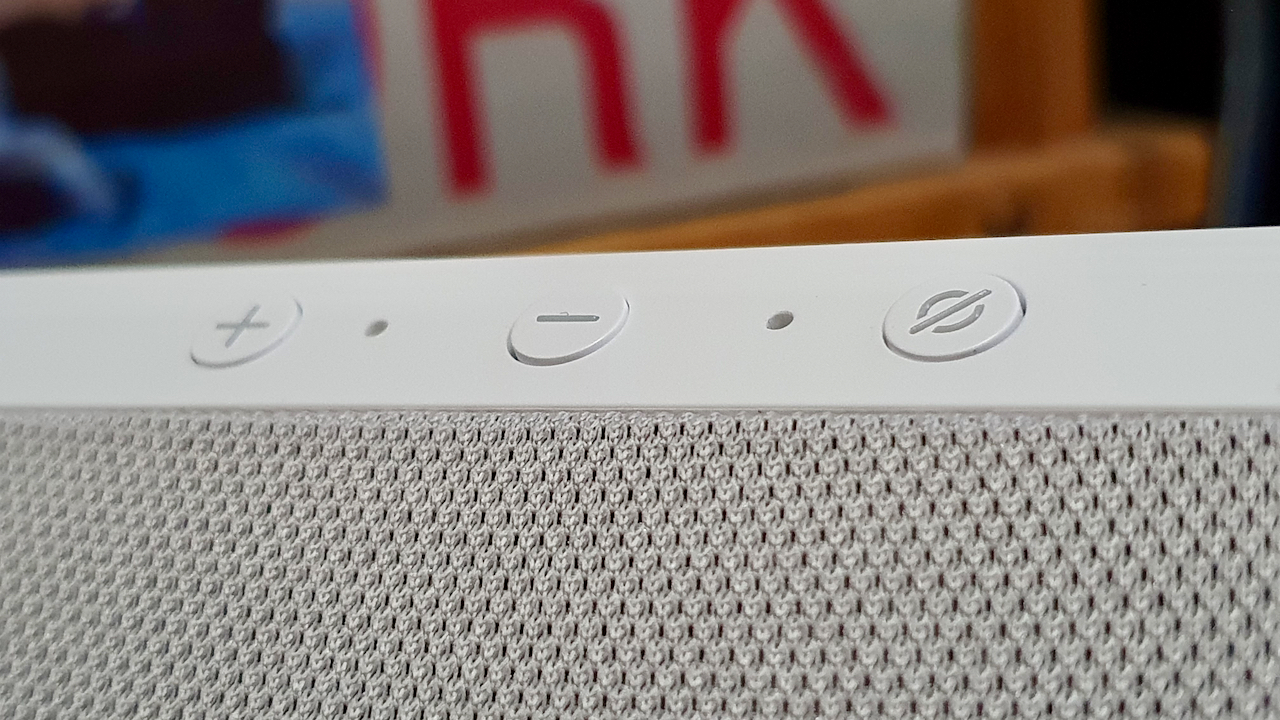 Em cima do aparelho, controle de volume e um botão para silenciar a Alexa.