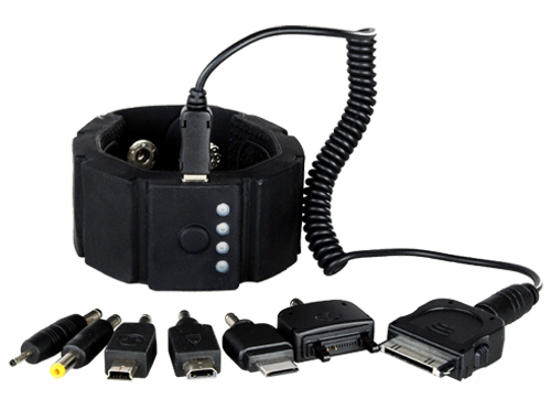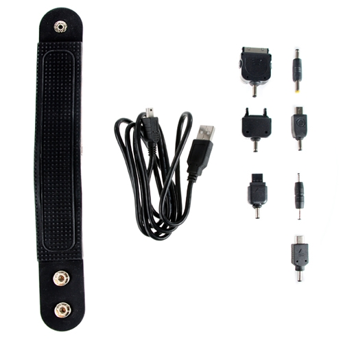 Como o nome diz, o produto é uma bateria de íons de lítio que se encaixa ao seu pulso e fornece energia para diversos aparelhos (são 7 conectores distintos!) com a ajuda de um cabo extensor. Diz o fabricante que “quando usado como fonte direta de energia, fornece até 3 horas de conversação ou 8 horas de uso de MP3”.