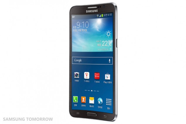 Pelo tamanho da tela (5,7″) e o acabamento em couro falso atrás, mais parece uma versão levemente envergada do Galaxy Note 3. A Samsung não falou nada de especificações técnicas: somente que o aparelho pesa 154 gramas e tem 7,9 mm de espessura. E que dá para usar com uma mão só (nada sobre o uso de canetinha stylus).