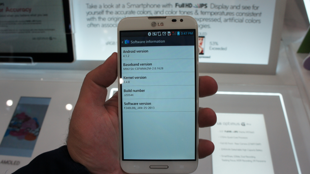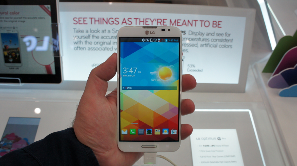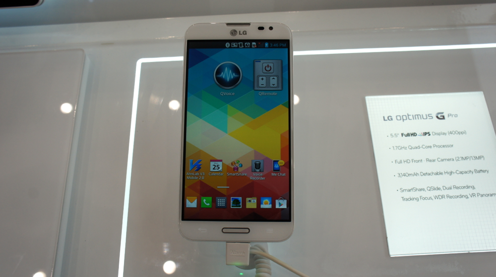 Ainda nas configurações, o LG Optimus G Pro vem com 2 GB e RAM, 32 GB de armazenamento interno (expansível com cartões microSD), tela IPS de 5,5 Full HD (1920 x 1080 com 400 ppi) e uma câmera de 13 megapixels traseira (2,1 megapixels na câmera frontal), rodando Android 4.1.2 “Jelly Bean”. A bateria utilizada tem capacidade de 3.140 mAH e é removível – segundo a LG, é possível usar um carregador sem fios para recarregá-la.
