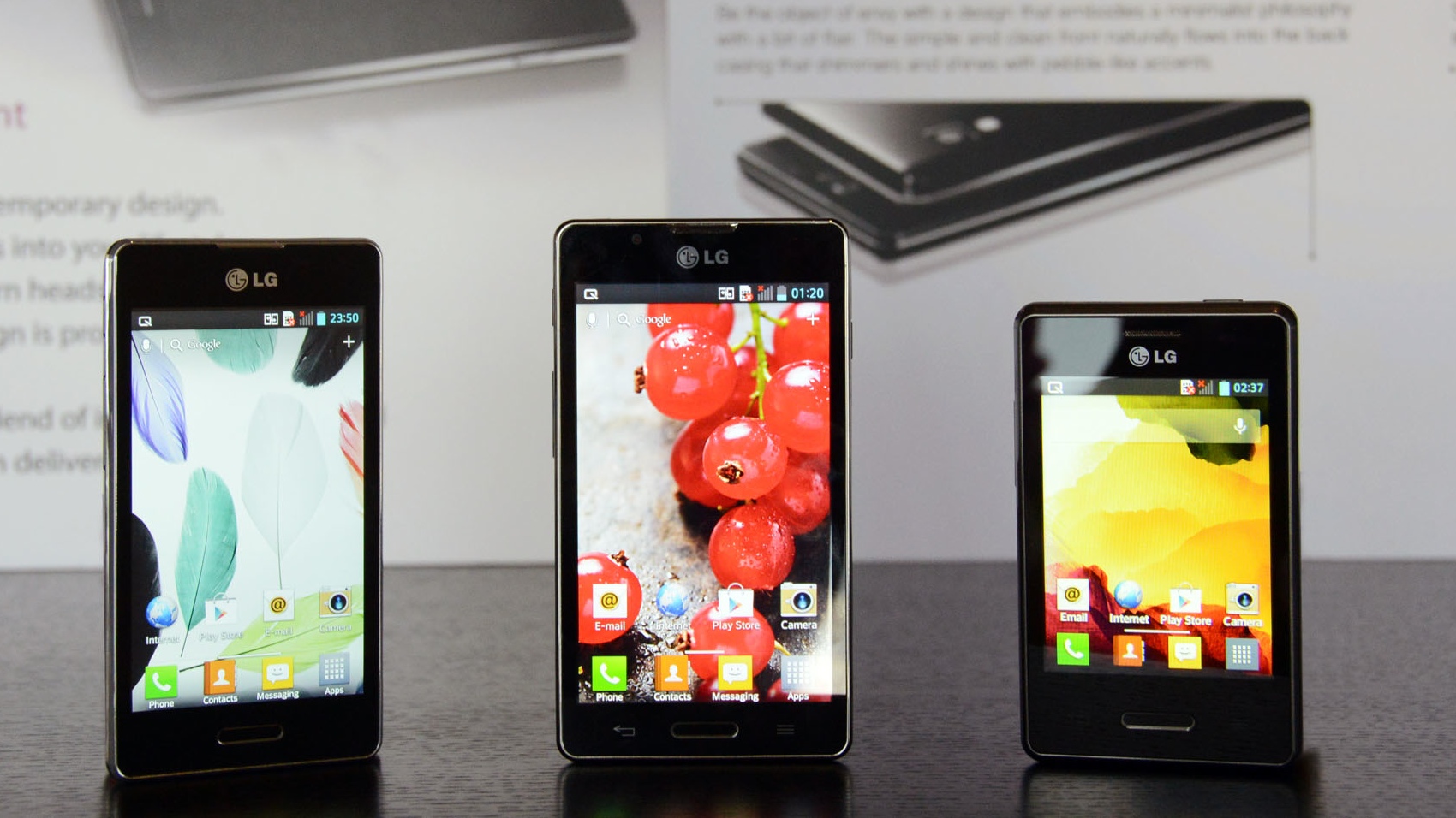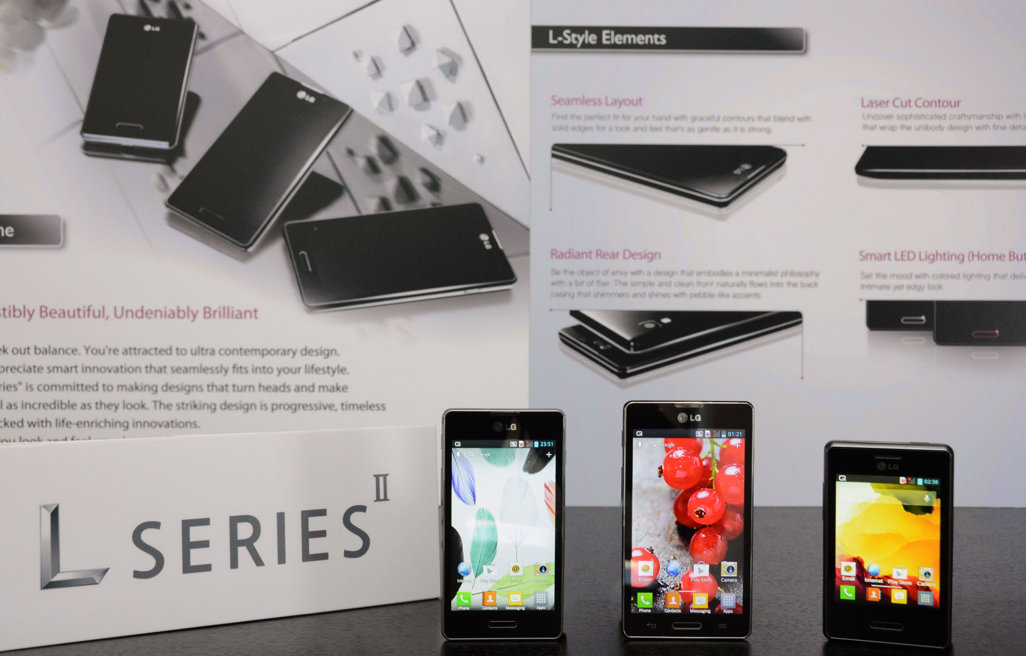 A nova família Optimus L II substitui os lançamentos da fabricante coreana no MWC 2012: são aparelhos com configuração intermediária e design atraente. Os tamanhos de tela se mantém: Optimus L3 II com 3,2″ (QVGA, IPS), Optimus L5 II com 4″ (WVGA) e LG Optimus L7 II com 4,3″ (também WWGA com IPS).